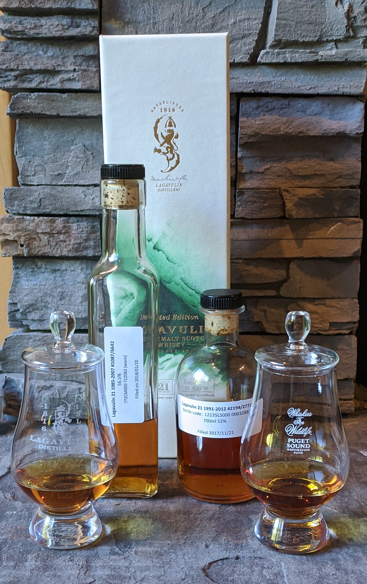 This is the second 21yr from Lagavulin, distilled in 1991 and bottled in 2012. Also a 70cl bottle for the UK market, at natural cask strength of 52%. This was also matured entirely in first-fill European oak sherry casks, and the text on the inside of the box basically says “yea, y’all liked the last 21 we did so here’s another.” As with the previous one, no stated info on color or filtering, with the same assumptions.