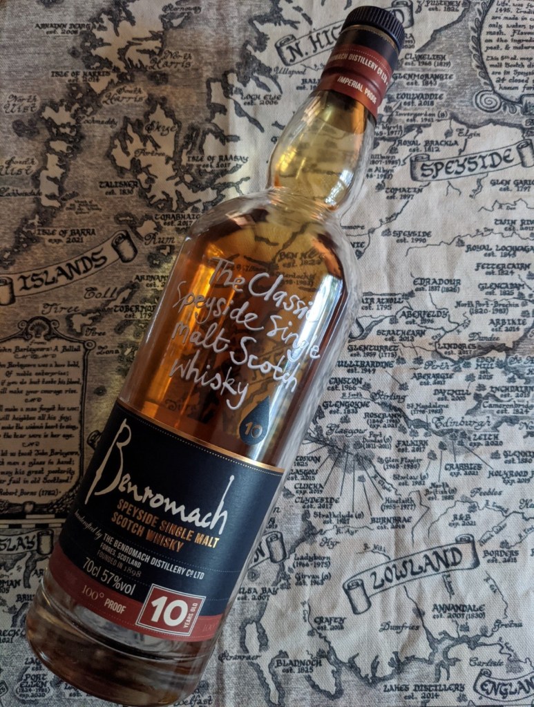 Benromach is certainly one of the more interesting outside-the-box Speysides to me. Owned by Gordon & MacPhail, they produce an ‘old-school’ lightly peated Speyside malt, and are to my knowledge one of only two established Scottish distilleries to experiment with brewer’s yeast in their wort (the other being Ben Nevis.) Now, I’ve not had great experiences with Gordon & MacPhail bottlings so far, but I really love what Benromach is doing– their house style, like Craigellachie, finds a bit-of-everything approach that stirs in enough funk to make it almost Campbeltown-like (which is always welcome.) I reviewed the 9yr Peat Smoke a while ago, which I enjoyed, and also tasted the regular 10yr once before from a mini, remembering it as having a strange jumble of notes that somehow still work very well together. I’ve heard wonderful things about this high-voltage version, called ‘Imperial Proof’ in the US (since 100° Proof refers to the British system and equates to 57.1% ABV), aged in a mix of ex-bourbon and ex-sherry casks, and now replaced by the vintage-stated Cask Strength batch series.