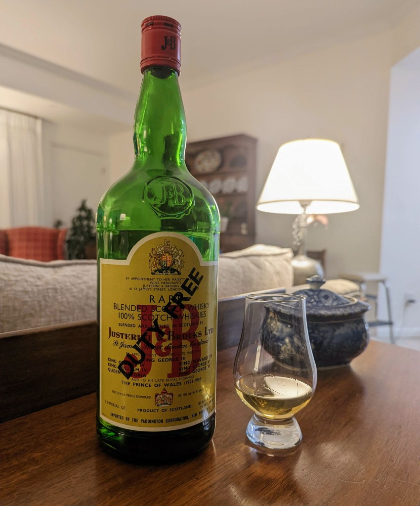 The contents turned out to be, essentially, a decade’s worth of duty-free whiskies that he’d picked up on vacation. The amazing thing is that that decade was the 1970s! There was a small pile of blended scotch and Canadian whisky, some of which was sealed. All the open ones seemed to be in perfectly drinkable condition, too. This whisky in particular caught my eye – J&B Rare is hard to date since they haven’t changed their label in ages, but considering what my grandpa told me, as well as the fact that there wasn’t a single tax sticker in that cabinet from after 1978, so this is almost certainly from around then.