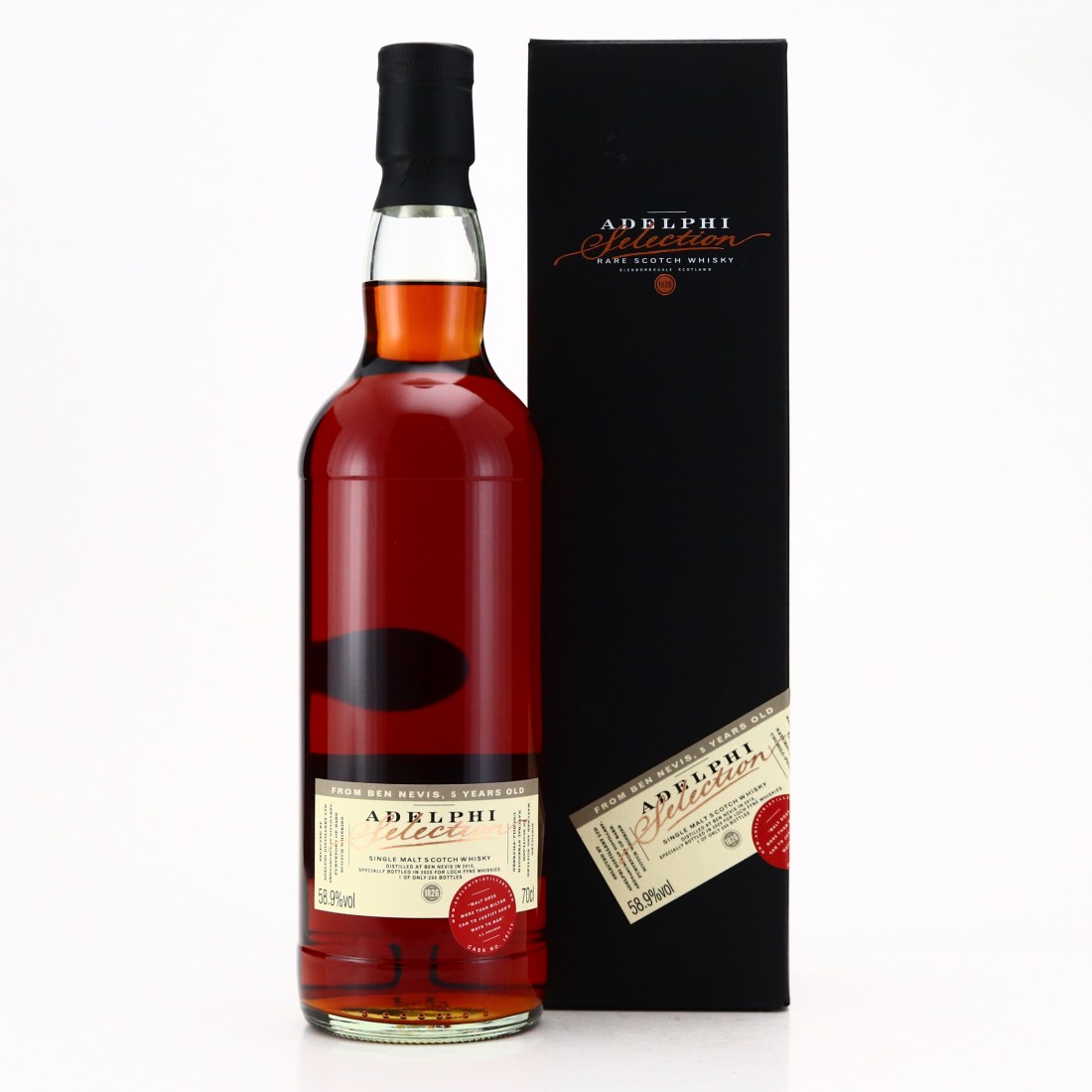 Guess: Scotland. Malt. Highland. 5-9 Year. 55-60% ABV. Adelphi Ben Nevis 5 Year.