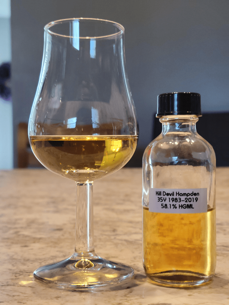 This rum comes to us from the independent bottler Hunter Laing & Co. (under the Kill Devil label). This Jamaican rum from Hampden estate was distilled in 1983 (it is the oldest distilled Hampden that was until recently available that I was aware of) and bottled in 2019 at cask strength with no additives. According to the Marks list on Single cask rum, this is HGML, which has an ester count of 1000-1100.