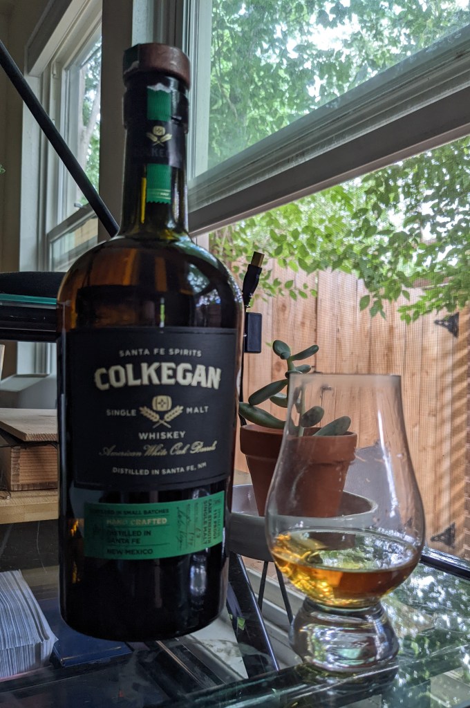 Santa Fe Spirits of New Mexico produces Colkegan single malt American whiskey— the distillery was an early ASM advocate and has always used a 100% malted barley mashbill (30% of which is currently mesquite-smoked.) They house their casks in a high-desert warehouse 7,000 ft above sea level with no humidity.