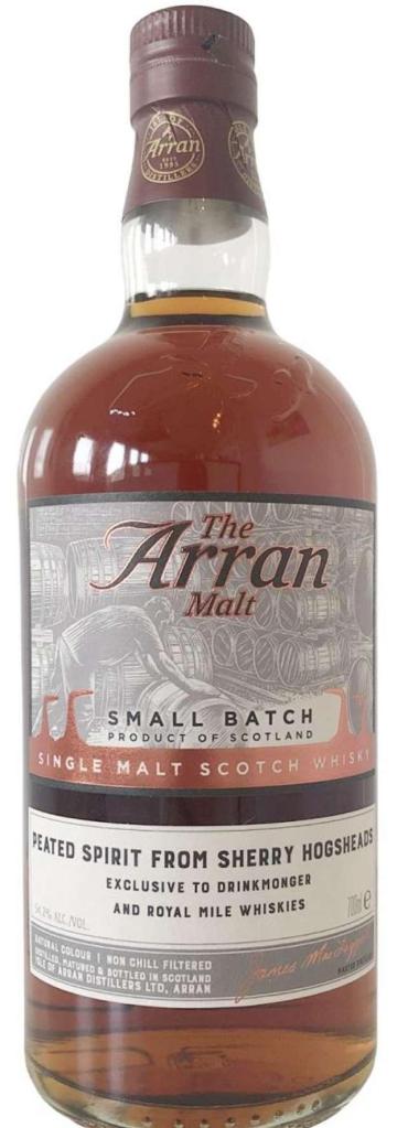 This 6 year old Arran was a blend of 3 vatted sherry hogshead that held peated Arran spirit for 6 years before being bottled at cask strength with no color added or chill filtration.