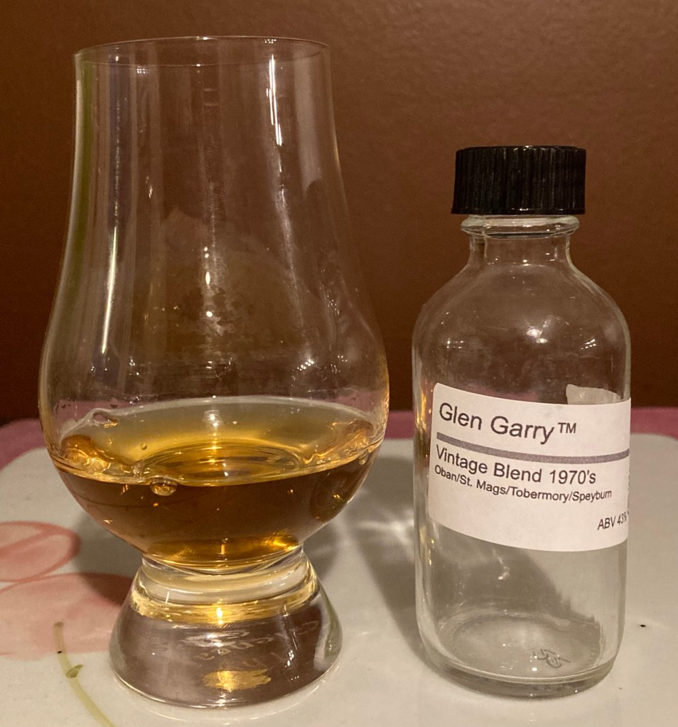 Not to be confused with Glengarry, another blended Scotch. Since this apparently hasn’t been made since the 1980s, that should help. From what I can tell, John Hopkins & Co. owned Tobermory for a while and started Speyburn. They were then acquired by DCL, and this would have been produced under that ownership, which would explain the Oban and St. Magdalene. I’m not sure how Tobermory would have gotten in here, because from what I understand it was closed in 1930 and not reopened under DCL. Who knows; not me. Reviewed from a sample thanks to Federal Agent. Rested about 20 minutes.