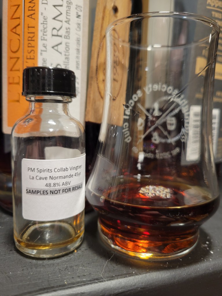 This was distilled from 50% apples and 50% pears grown in an orachard with trees that were 20-200 years old. This Calvados was distilled on a small, mobile, wood-fired column still. The distillate then aged for 45 years in French Oak before being bottled at cask strength with no additives. This single cask was distilled at Cave Normande in the commune of Saint-Cyr-du-Bailleul in Normandy.