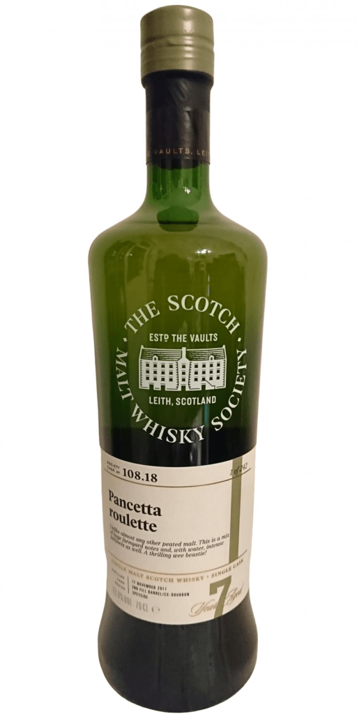 Conclusion: Surprised I didn’t notice the ABV at first, because it was quite hot the second time. Calmed down with water. Still haven’t had unpeated Allt-a-Bhainne, but the peated stuff is not bad at all. Reminds me of Caol Ila, obviously. This is kind of one-dimensional, as I find young peat often is. Knowing SMWS, I expect it’s pricier than comparable young, brash peat, but it would fill that niche pretty well.