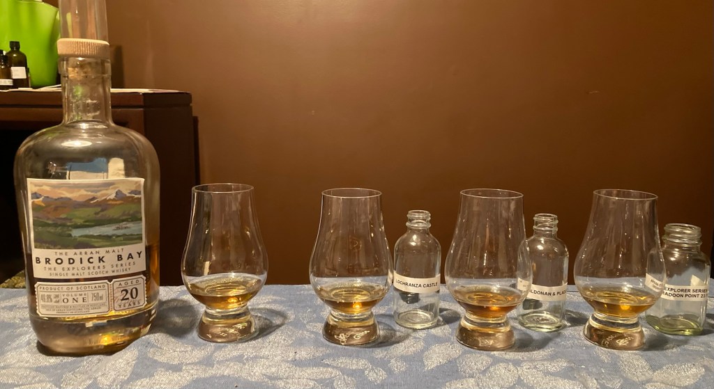 Arran is a favorite of mine, taking to sherry especially well in my opinion. A new-ish distillery which will celebrate their 30th anniversary next year. The Explorer Series was released yearly from 2018 to 2021. Each was a limited edition of 9000 bottles, aged in different cask combinations and taking their names from landmarks around the Isle of Arran. They ranged from 20 to 23 years old. I got a bottle of Brodick Bay as a promotion gift to myself, and zSolaris generously helped me out with samples of the others.