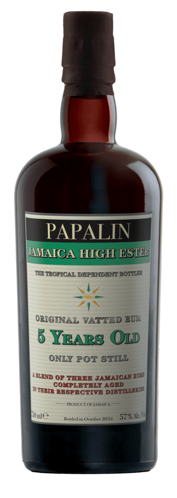 Papalin is a series of blended rums from Velier. This entry is a blend of rums from three Jamaican distilleries: Worthy Park WPL (60-119 gr/hlPA), Long Pond STCE (550-700 gr/hlPA), and Hampden C<>H (1300-1400 gr/hlPA). All distilled on pot stills and aged on site before being blended. Reviewed from a sample. Rested about 15 minutes.