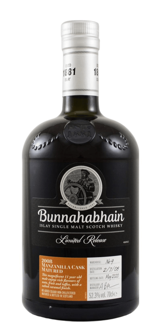 Manzanilla casks are some of my favorites, but not that common. I’d been eyeing this limited edition Bunnahabhain for a while, still in stock at a nearby store until a year or so ago. The nearly $200 price tag put me off: seemed very steep for an 11 year old, even something limited. Evidently someone disagreed, as one day it was gone. Let’s see if I missed out. Reviewed from a sample. Rested about 15 minutes.