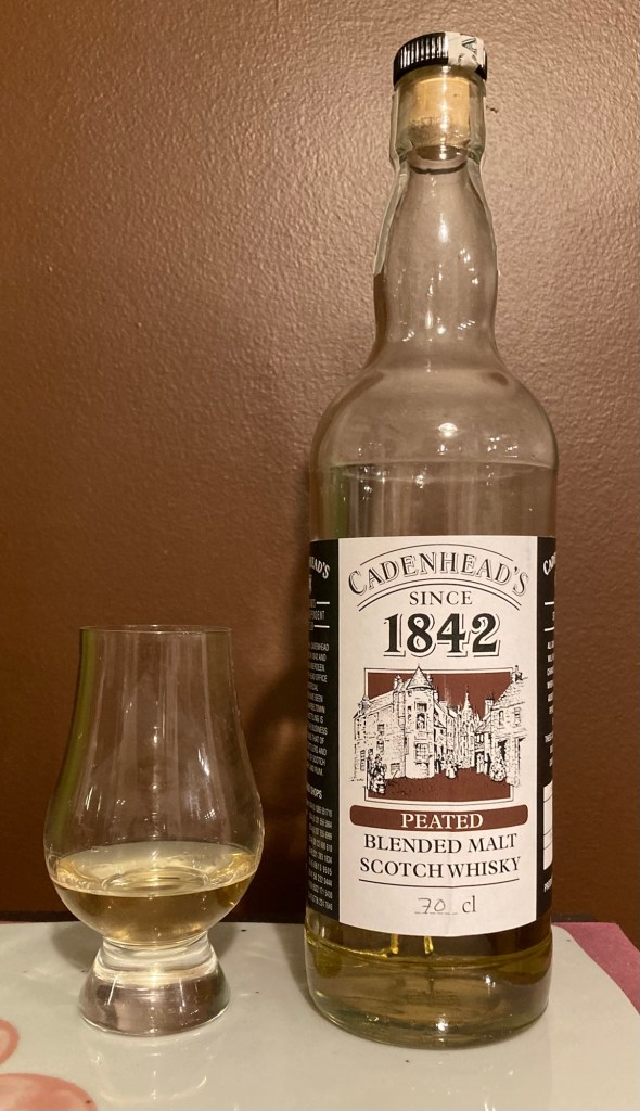 One of the blended malts available from the Cadenhead’s shop, which I suppose means some cask ends that they chuck in a tank for a while before filling. Visited the Cadenhead’s in Edinburgh a few years and got a small bottle of the sherry cask to drink on the trip reviewed here and this bottle of the peated which I brought home. Rested about 15 minutes.