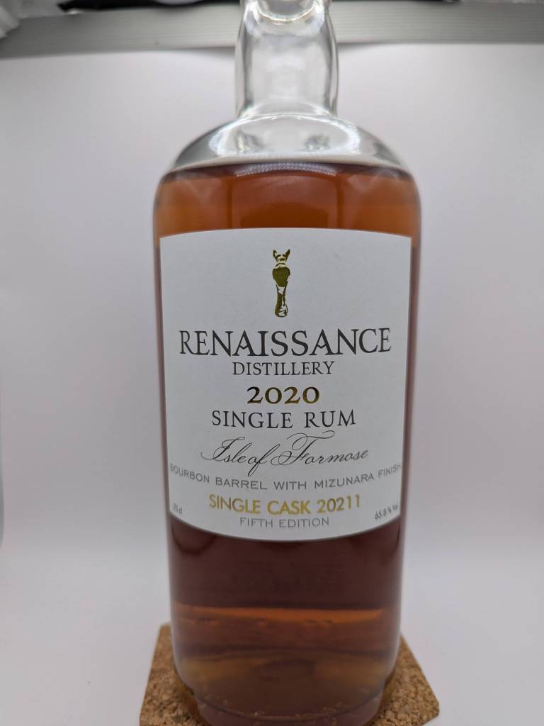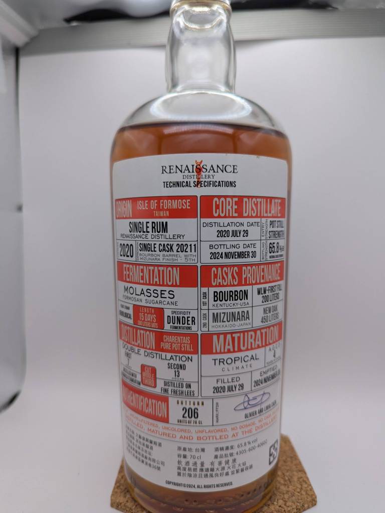 This is a bottling of rum from Renaissance distillery located on Taiwan. This rum was distilled from molasses made from Taiwan sugarcane. It fermented for 15 days with dunder and was double distilled on a Charentais pot still. It aged for a time in first fill WLW ex-bourbon casks before being finished in a Mizunara cask. It was then bottled at cask strength with no additives. It aged for 4 total year at origin.