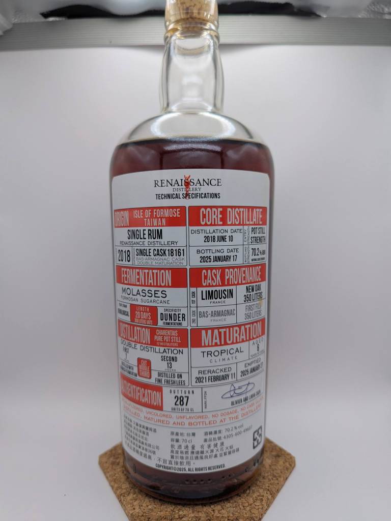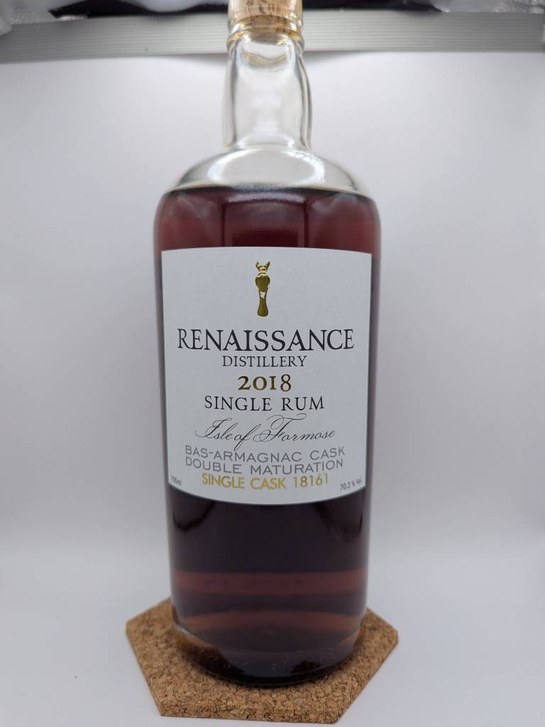 This bottle of rum comes from the Renaissance distillery located in Taiwan. This rum was distilled from molasses in 2018 from Taiwanese sugarcane. It then was fermented for 20 days with dunder. It was distilled two times on a Charentais pure pot still before being aged in Limousin new oak for 3 years and then underwent a 2nd maturation in a first fill Bas-Armagnac for another 3 years. It aged entirely at origin and was bottled at cask strength with no additives.