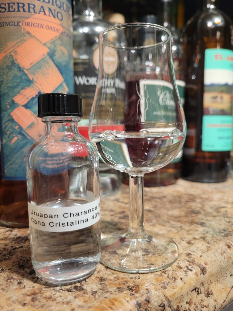 Here we have a bottle of rum from Mexican producer Uruapan. This rum was distilled from single estate Caña Mexicana sugarcane, fermented in the open with wild yeast for one to two week, and bottled with no additives.